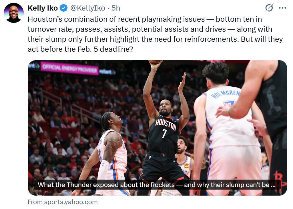 针对这样的局面,在距离赛季中期交易截止日越来越近之际,《雅虎体育》火箭跟队记者Kelly Iko发布长文披露火箭队内部想法与交易计划。