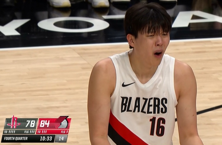 比赛中杨瀚森在与亚当斯对抗时领到第五次犯规,无奈的表情成为焦点。