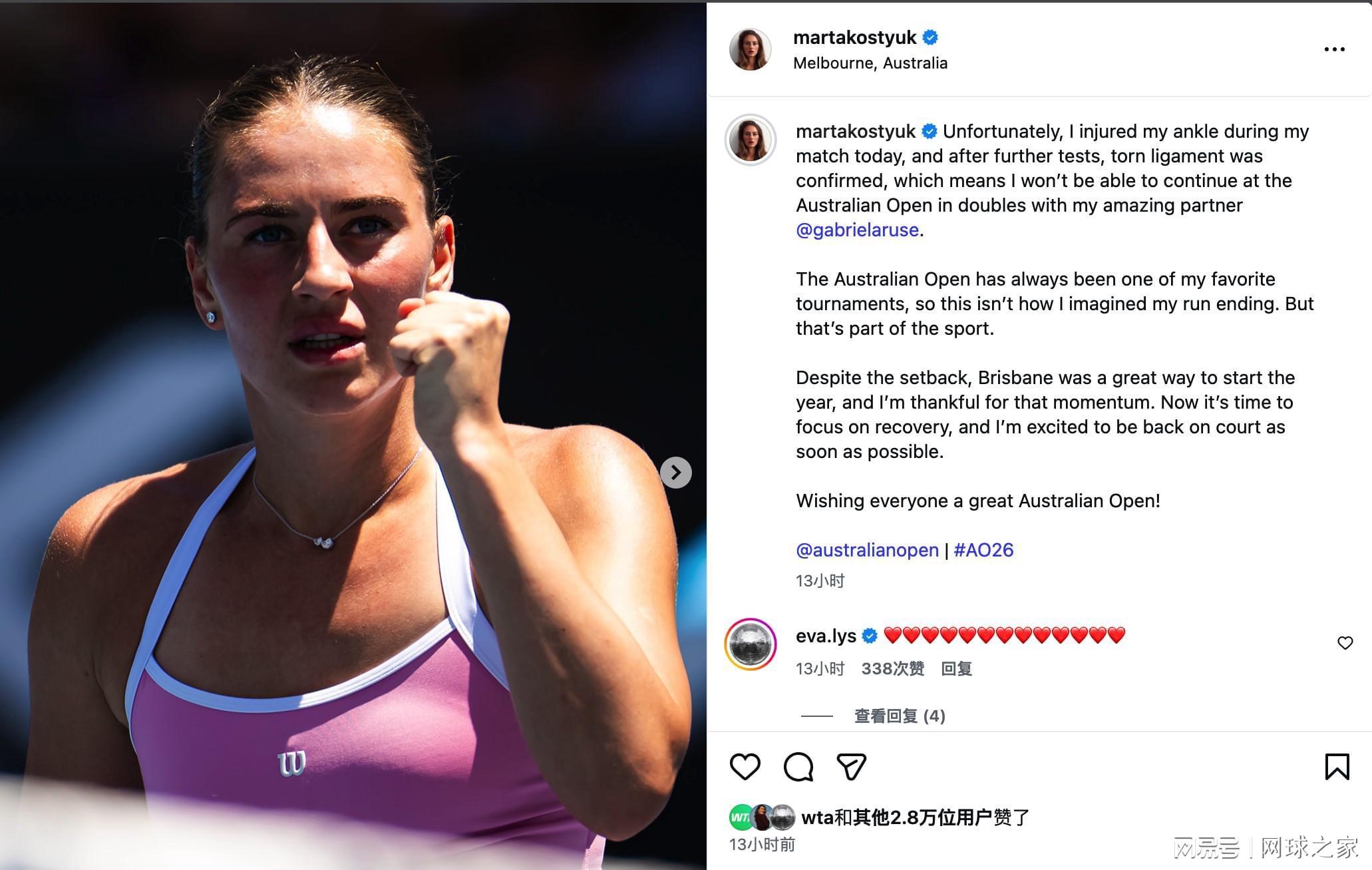 布里斯班站决赛后,科斯秋克她带着这份击败多位世界前十的自信来到墨尔本公园,准备迎接自己第七次澳网正赛之旅。然而比赛倒数第二局的那次摔倒改变了一切,科斯秋克不仅输掉了比赛,更被确诊韧带撕裂,将面临漫长的康复期。她的团队在社交媒体上发布声明:“玛尔塔将专注于康复,我们会全力支持她尽快重返赛场。” 这场意外为所有职业选手敲响了警钟:在追求状态高峰与保持身体健康之间,需要找到微妙而关键的平衡点至关重要。(来源:网球之家 作者:小迪)